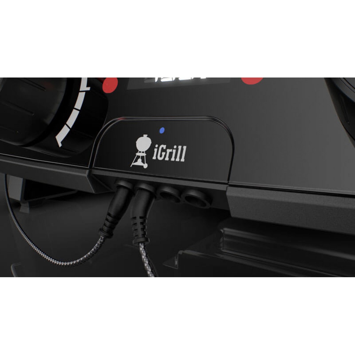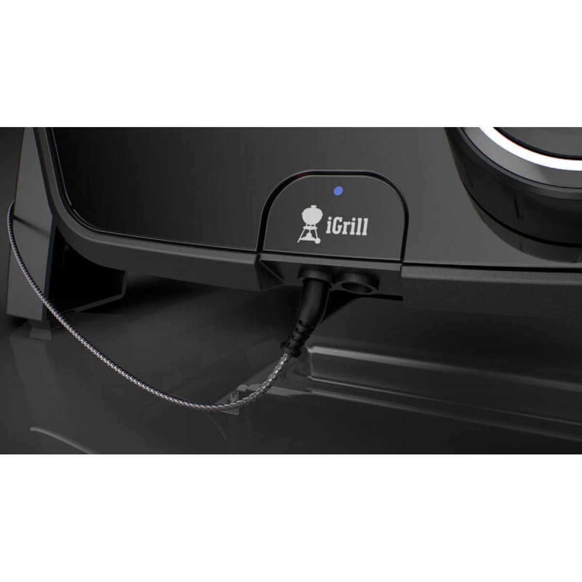 Встроенная функция iGrill обеспечивает мониторинг температуры внутри еды и температуры гриля в режиме реального времени с помощью приложения iGrill. Когда загрузите приложение Weber iGrill, подключите датчик к порту iGrill на передней панели барбекю и вставьте датчик в еду. Проведите провода датчиков через каналы c боков гриля.