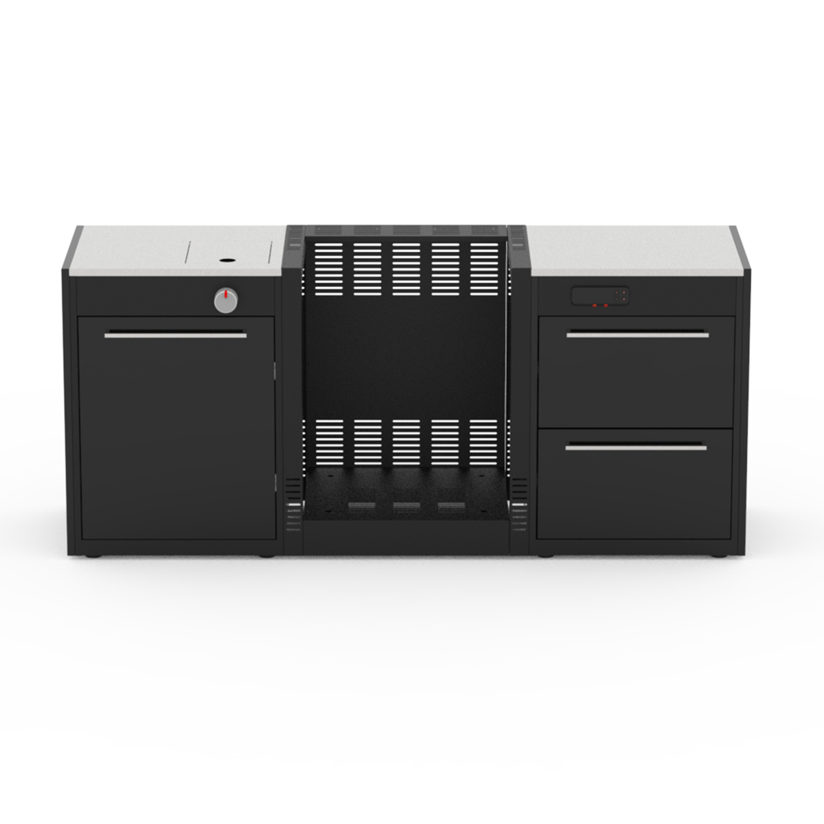 Функциональные модули для обустройства уличной кухни позволяют создать удобную и стильную BBQ-зону на вашей террасе. В комплект входит модуль с боковой конфоркой, оснащённый нишей для хранения газового баллона или крупногабаритных аксессуаров, а также модуль с выдвижными ящиками грузоподъёмностью до 65 кг — идеальное решение для чугунной посуды и другого оборудования для барбекю, которое должно быть под рукой.