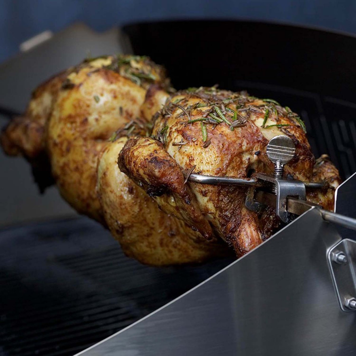 Этот вертел позволяет вам общаться или отдыхать, пока блюдо медленно вращается на гриле и равномерно пропекается со всех сторон.