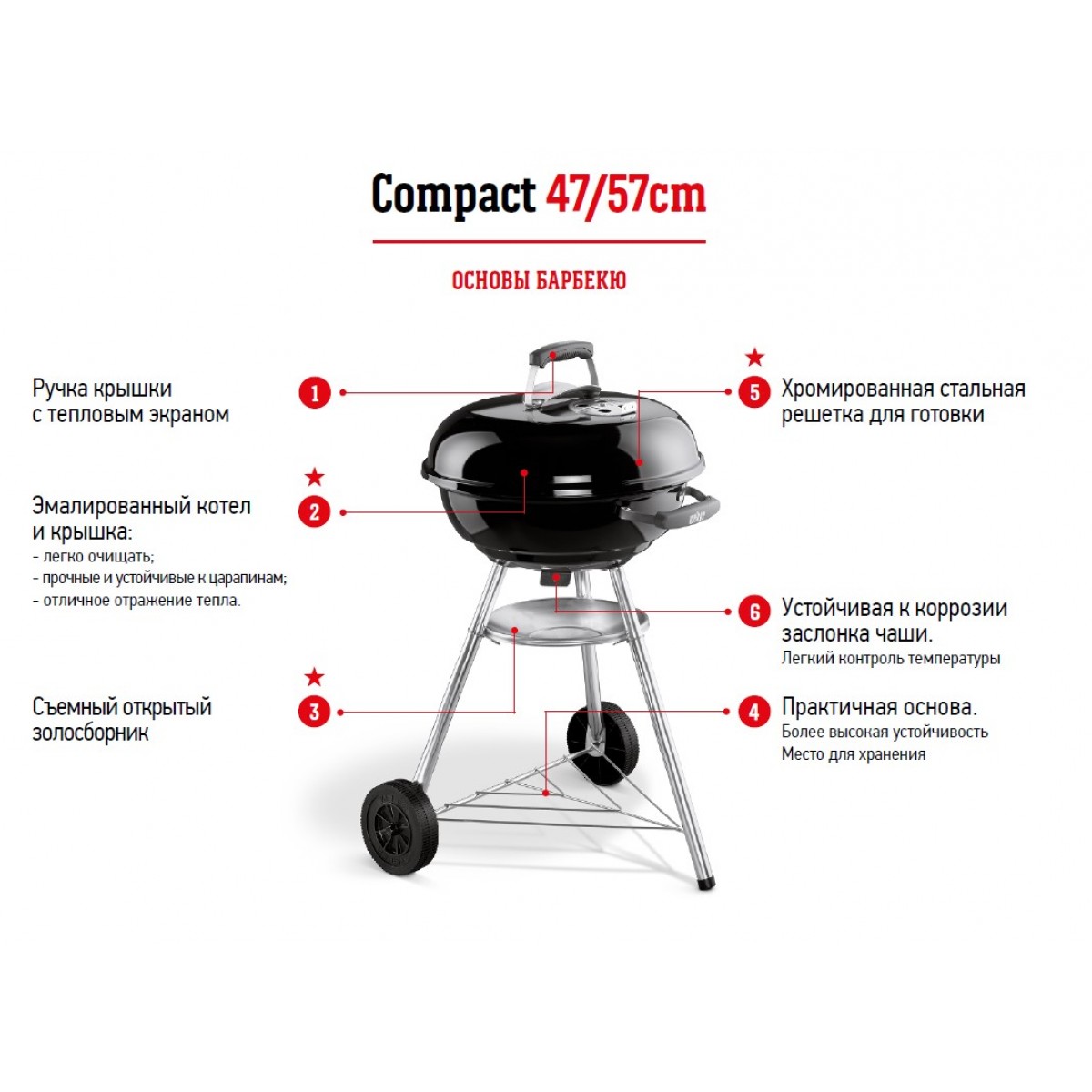 Это удобно для транспортировки, и вполне подходит для приготовления продуктов небольшого размера. Они имеют классическую форму котла. Более глубокую с высокой крышкой. Гриль-барбекю Compact Kettle станет вашим незаменимым помощником в освоении искусства барбекю. При желании вы можете убрать решетку гриля и воспользоваться шампурами для приготовления шашлыка на гриле.