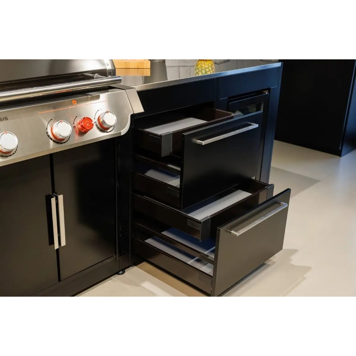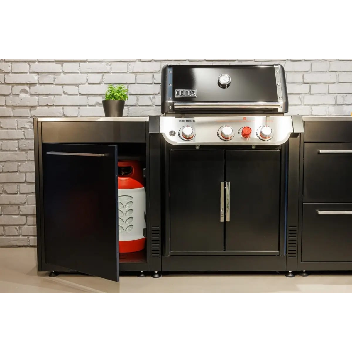 Він пропонує достатньо місця для зберігання газових балонів, а також для громіздких аксесуарів для барбекю або іншого обладнання. Існує також можливість легко та просто встановити холодильник (максимальний розмір: 598 (Ш) x 830 (В) x 560 (Г) мм, що надає вашій індивідуальній кухні барбекю ще більше переваг. Висота стільниці: від 930 до 995 мм - регулюється індивідуально. Розміри: 640 (Ш) x 611 (Г) мм - Шухлядний модуль