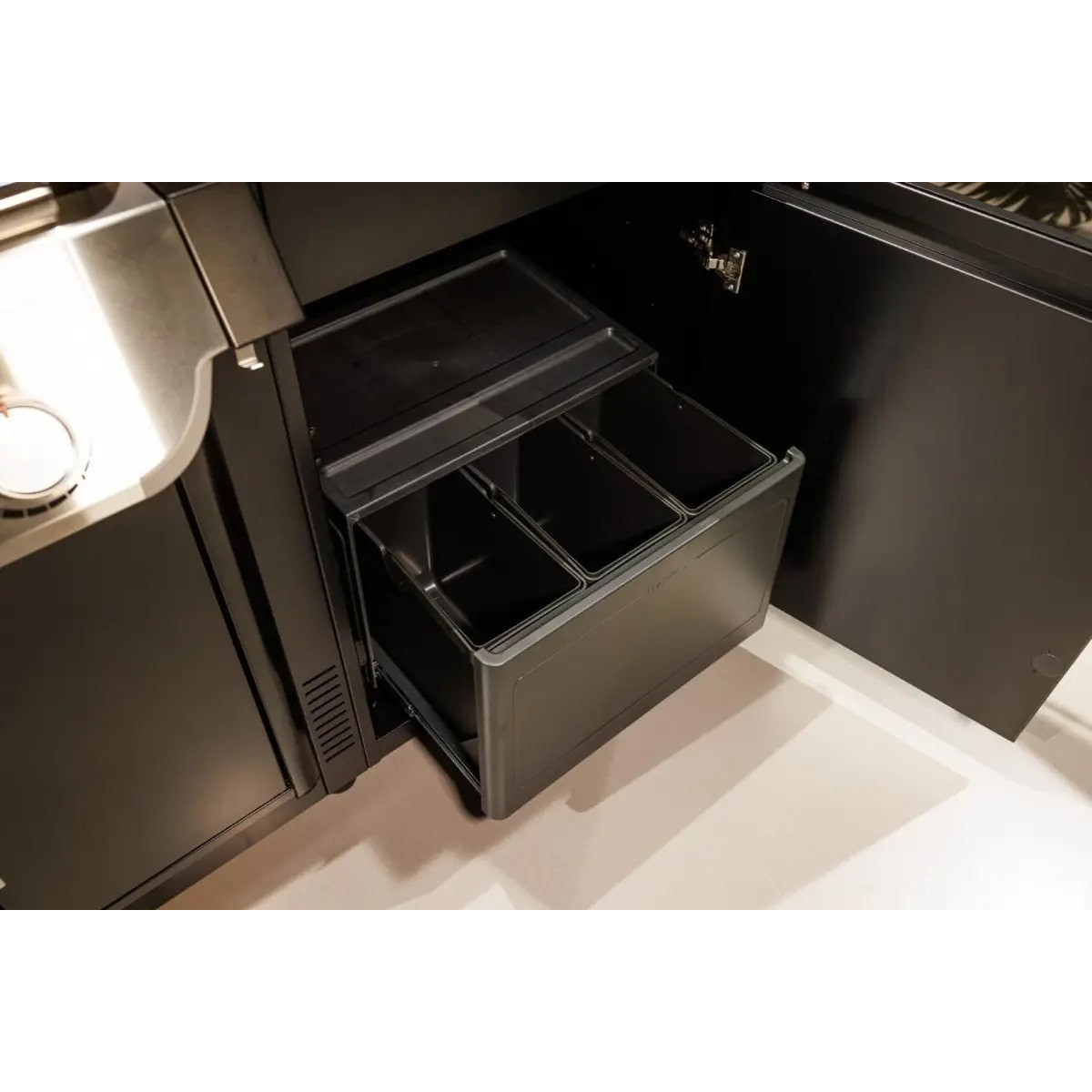• Фурнітура Soft-close від Blum© забезпечує довговічність і високу стабільність. Механізм плавного закривання на дверцятах і ящиках надає вашій кухні на відкритому повітрі елегантності та забезпечує м’яке закривання.