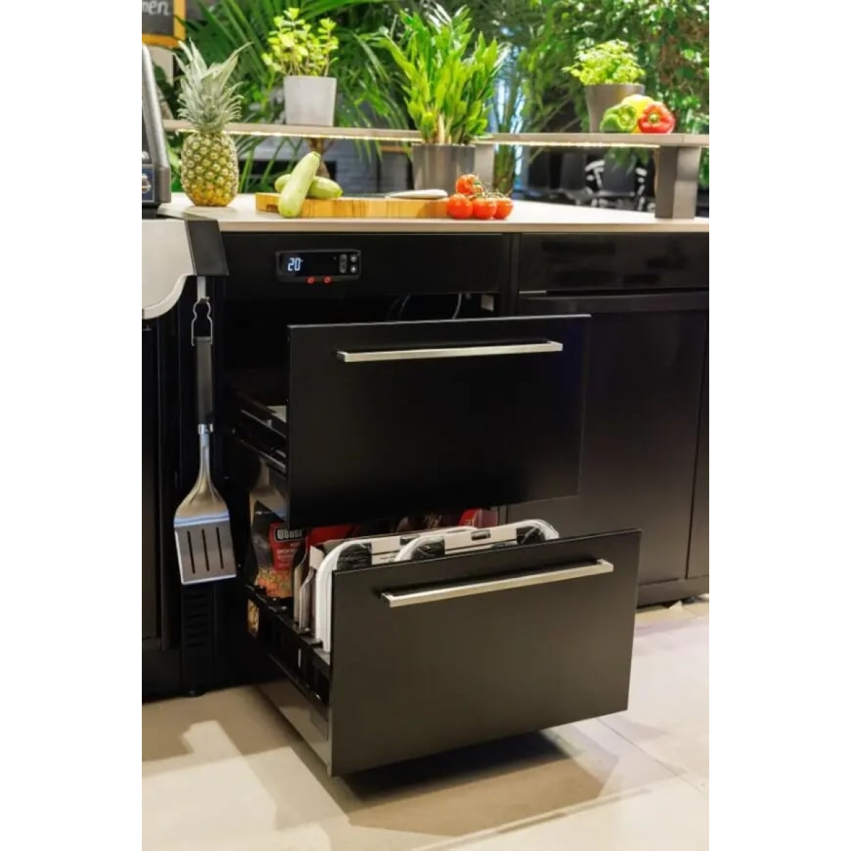 • Фурнітура Soft-close від Blum© забезпечує довговічність і високу стабільність. Механізм плавного закривання на дверцятах і ящиках надає вашій кухні на відкритому повітрі елегантності та забезпечує м’яке закривання.